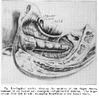 The first modern observation of this in relation to coccygeal pain was in 1859 (by Simpson), as reported in his classic paper “Coccygodynia and pain in the superior gluteal region” by Thiele (1937). Thiele developed a simple strategy for treating high-tone muscles in the pelvic floor – now named after him as Thiele Massage. See the photograph of an illustration from his paper in the Journal of the American medical Association – the legend of which states: “Sagital section showing the position of the finger during massage of the levator ani, coccygeus and piriformis muscles. The finger sweeps from side to side, massaging lengthwise of the muscle fibers.”